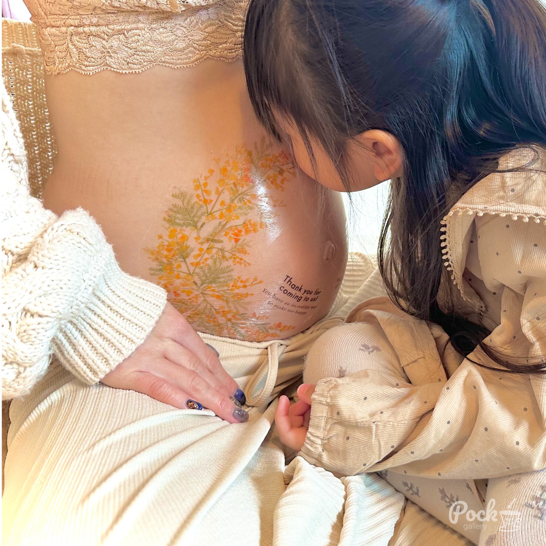 マタニティ、マタニティフォト、ベリーペイントシール、マタニティペイントシール、ボディーシール、タトゥーシール、お腹、シール、安産祈願、妊婦、和装、春、ナチュラル、ミモザ、ベビーシャワー、マタニティペイント
