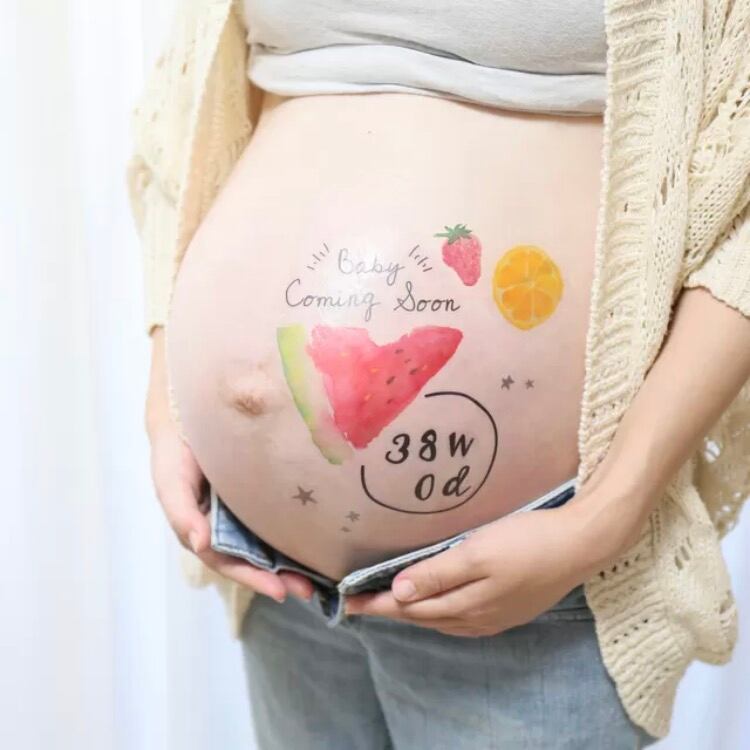 マタニティ、マタニティフォト、ベリーペイント、マタニティペイント、ボディーシール、タトゥーシール、お腹、シール、安産祈願、妊婦、フルーツ、いちご、スイカ、ピーチ、オレンジ、ぽっく、ギフト、ベビーシャワー、プレゼント